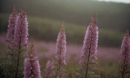 Heather field, spring flowers on a green meadow, beautiful wallpaper with bokeh, springtime, AI Generated illustration