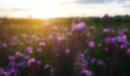 Natural flowers willow-herb defocussed background. Summer meadow at sunset light, blurred background