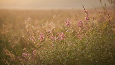 wild healthy and beautiful in the field of grass ivan tea at dawn