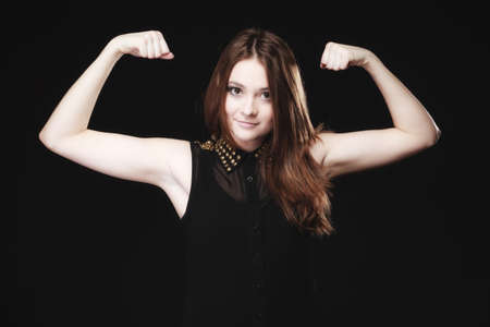 strength and power concept. Young woman teen girl showing her muscles on black