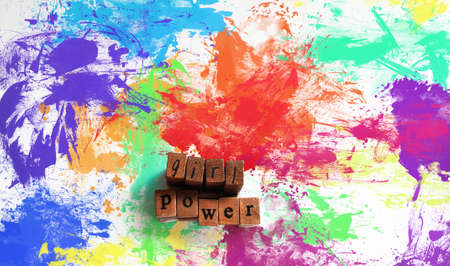 Girl power words made of old wooden stamps on white minimal background