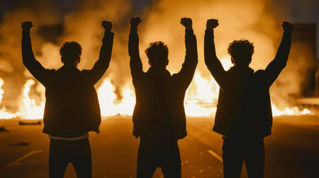 A diverse assembly of demonstrators raises their fists against a backdrop illuminated in intense red lighting. This image symbolizes solidarity and resistance within social causes.