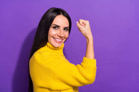 Profile photo of charming cheerful person arm flex show biceps toothy smile isolated on violet color background