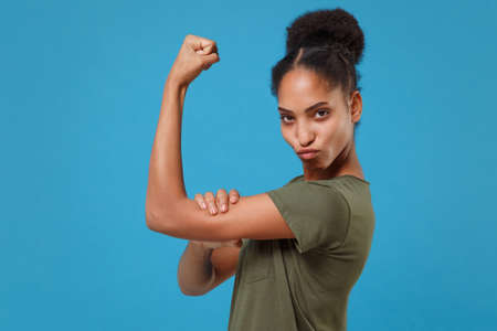 Side view of young african american woman girl in casual t-shirt posing isolated on blue background studio portrait. People emotions lifestyle concept. Mock up copy space. Showing biceps, muscles.