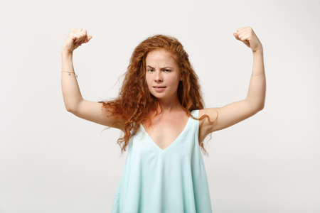 Young strong redhead woman girl in casual light clothes posing isolated on white background, studio portrait. People sincere emotions lifestyle concept. Mock up copy space. Showing biceps, muscles.