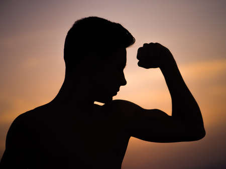 Silhouette of a man with hands raised. Received power from god