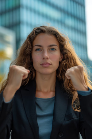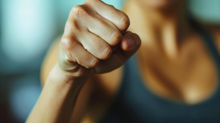 A close up of a woman in black tank top fist raised, AI