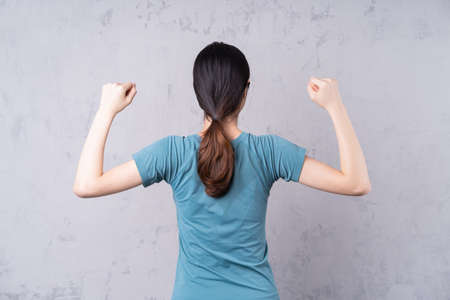 happy young woman showing her muscles