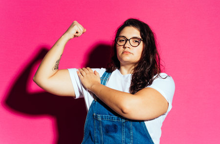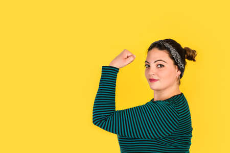 Curvy woman doing we can do it gesture on a yellow background