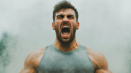 Powerful male athlete showing determination and strength while exercising outdoors with intense expression and dust flying around him during workout session