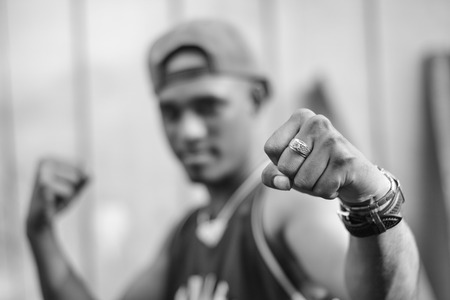 Raised hands of african american men clenched into fists