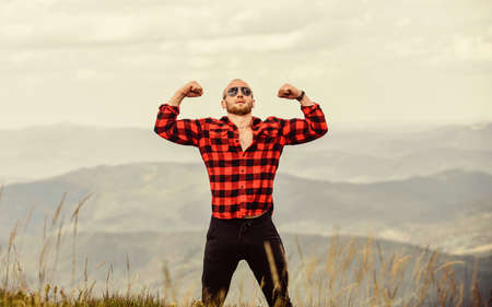 sexy macho man in checkered shirt. travelling adventure. hipster fashion. man on mountain landscape.