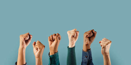 Raised hands with clenched fists of multiracial people