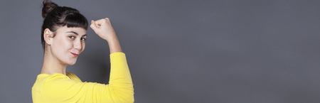girl power concept - thrilled young brunette woman showing her muscles for feminine independence and strength,studio shot, copy space banner
