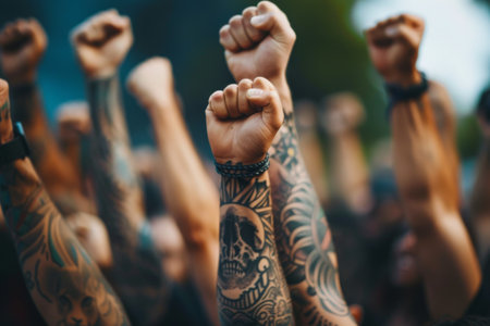 Tattooed fans raising their fists in solidarity, AI generated