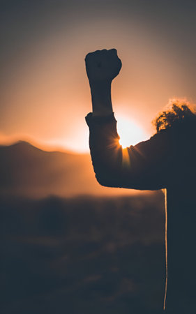 A muscular figure, fist raised high, embodies unwavering resolve and triumph over adversity This potent image captures the essence of determination, resilience, and the relentless pursuit of goals It evokes hope, strength, and the power of the human spirit, inspiring action and celebrating leadership, achievement, and unwavering commitment A visual AI Generative