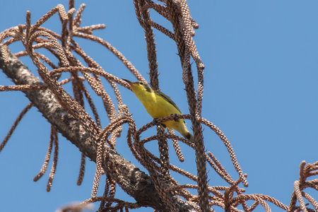 Small Yellow Olive backed Sunbird Perched on Bare Tree Branch Against a Bright Sky