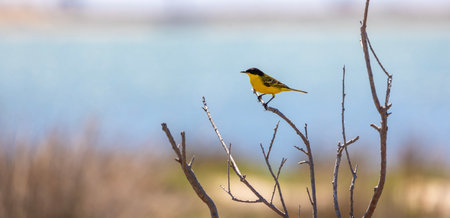 Yellow Wagtail bird perched on a dry branch with water in the background