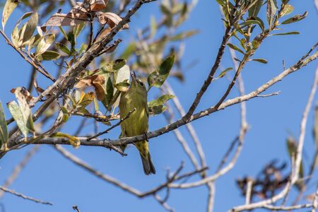 Resourceful Orange Crowned Warbler bird perched a top the tallest tree in the estuary while looking for bugs to eat among the leaves.