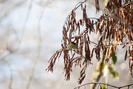 Orange-crowned warbler (Vermivora celata) foraging on frozen leaves