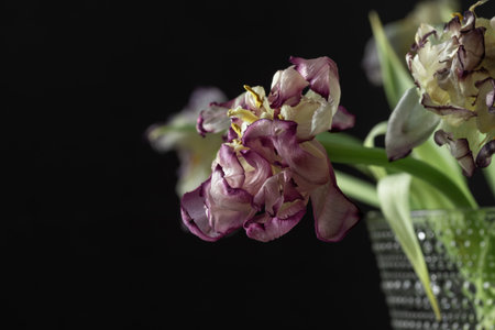 A bouquet of wilted parrot tulip flowers on the black background. Symbol of death, mourning, and the memory of a beloved who has passed, sense of loss and transience