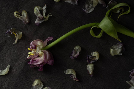 A lonely wilted parrot tulip flower on the dark background. Symbol of death, mourning, and the memory of a beloved who has passed, sense of loss and transience