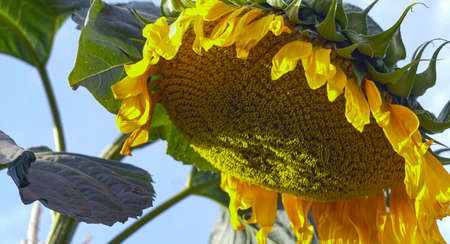 ripe sunflower bent to the ground, horizontal