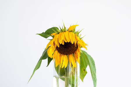 Dying Sunflower head and stem in a vase, close up studio shot, isolated on white background.