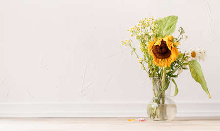 autumn concept. A bouquet of withered flowers and a sunflower in a vase