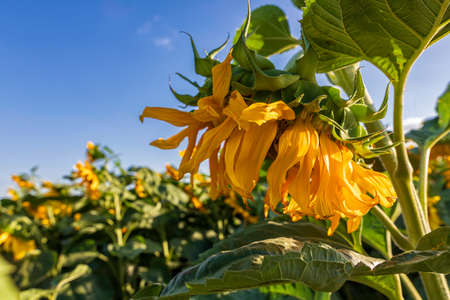 Wilted sunflower in the field