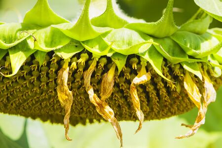Close-up of a dying sunflower in the autumn field with nature background.