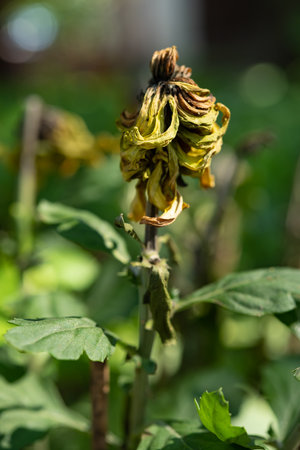 side view dead chrysanthemum flower in the outdoor at vertical composition