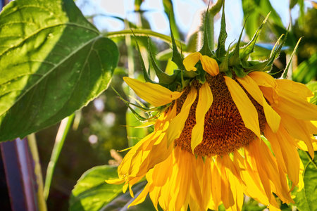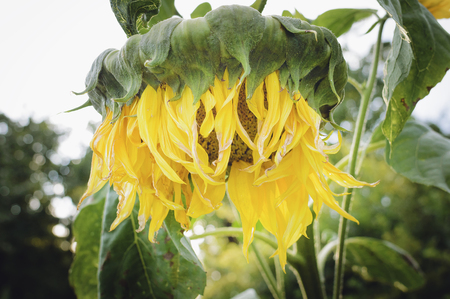 Dried ripen yellow common sunflower (Helianthus) and blurred green leaves in soft focus, in a garden in a sunny summer day, beautiful outdoor floral background