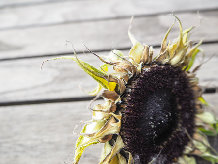 Sunflower on wooden table (dead flower)