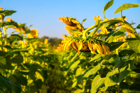 blossoming withering sunflower in the field by a summer day