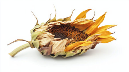 This image features a beautifully dried sunflower with vibrant yellow petals and withering leaves, captured against a clean white background, emphasizing aging beauty.