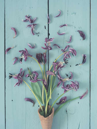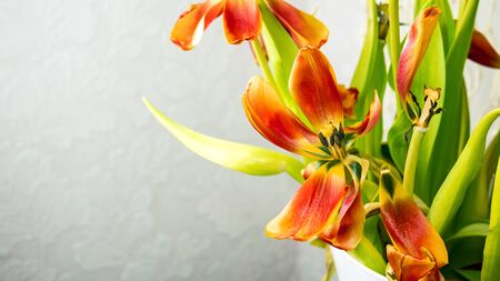 Bouquet of red wilting tulips with flying petals on light gray background. Copy space for text. Selective focus. Close-up.