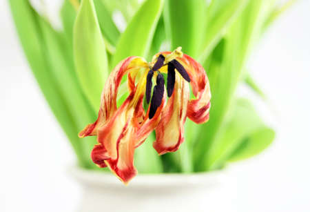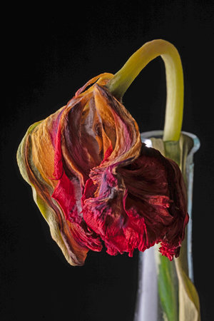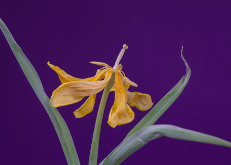 Old withered yellow tulip on a dark background, Past beauty with abstract fragility