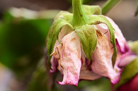 photo of a dry, withered pink rose, distinct petal texture, dry flowers