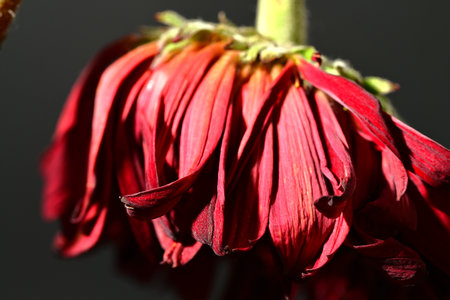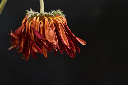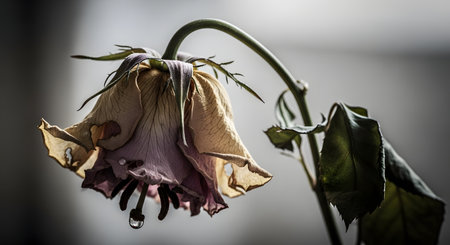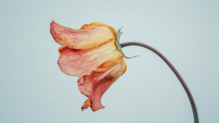 Isolated dead flower with drooping stem and faded hues on a plain background, symbolizing fragility and natural cycles