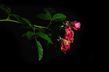 Withered rose flowers on a leaning branch. Photo on a black background, landscape orientation.