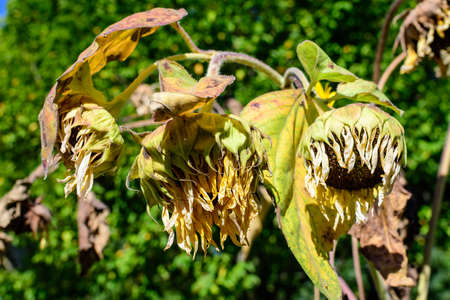 Dried ripen yellow common sunflower (Helianthus) and blurred green leaves in soft focus, in a garden in a sunny summer day, beautiful outdoor floral background