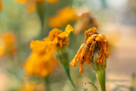 Dried freesia plants extreme macro close-up in yellow and orange colors