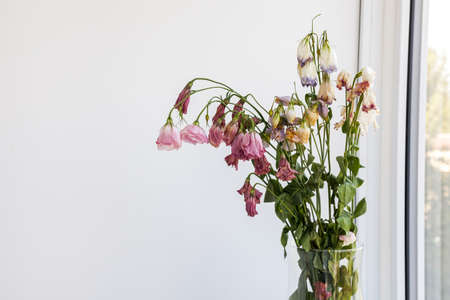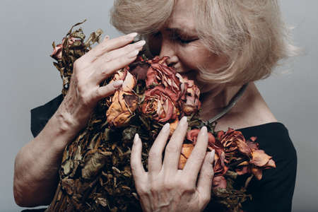 Upset elderly woman crying and holding withered dry old rose flowers bouquet