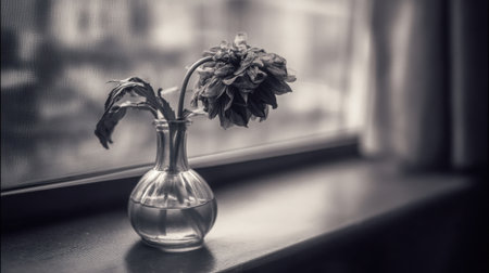 A poignant still life composition featuring a withering flower in a glass vase, highlighting themes of time and beauty in monochrome tones.