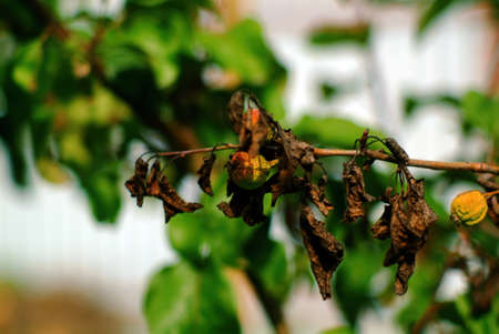 Dry leaves hanging downwards from a tree during the autumn season showing its change of colour from green to brown