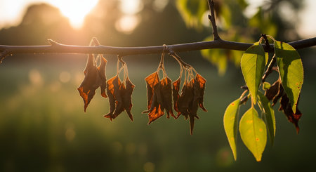 A close-up of a tree branch with withered brown leaves hanging alongside green ones, backlit by the golden light of a sunset. The image captures the transition of seasons and the cycle of nature in a melancholic yet beautiful way.