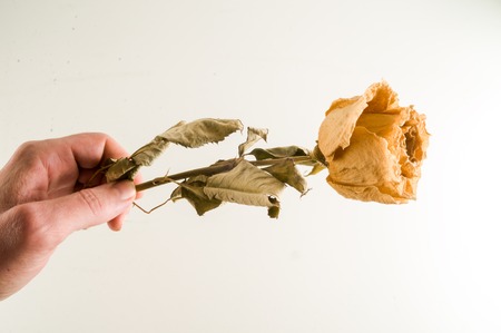 the man's hand holds out a bouquet of withered flowers. dry red roses and a copy of the space