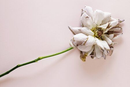 One single withered dry red rose lie on a beige background. Top view floral composition. Copy space
