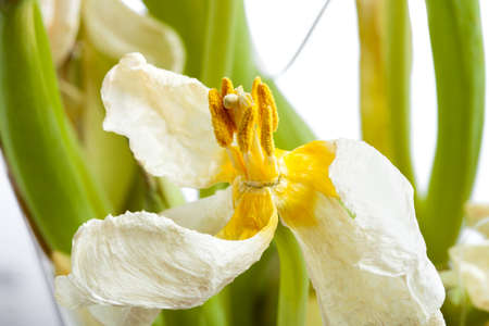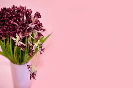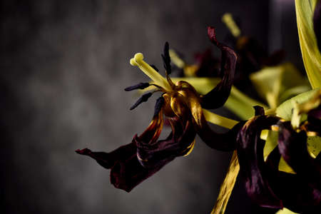 bud of a wilted tulip, a fade flowers close up dead plant.